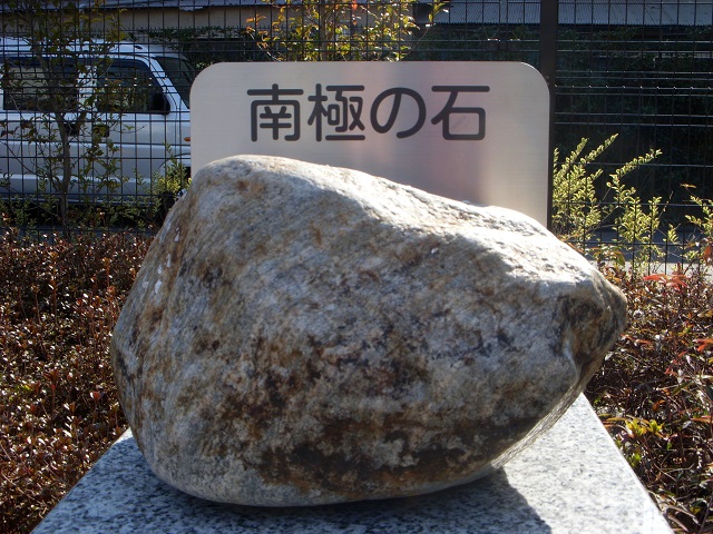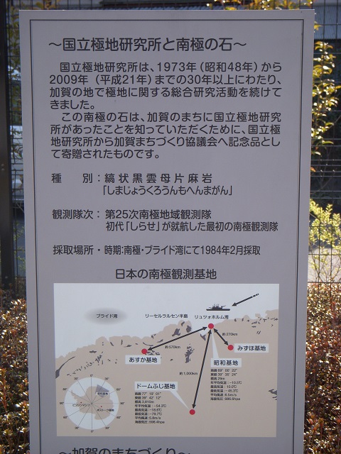 この南極の石は、加賀のまちに国立極地研究所があったことを知っていただくために、国立極地研究所から加賀まちづくり協議会へ記念品として寄贈されたものです。