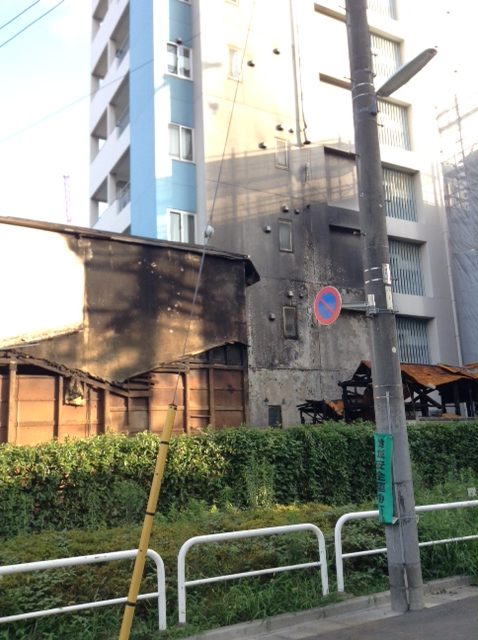 木炭化した住宅と壁面が黒くなってしまったマンションが見える。