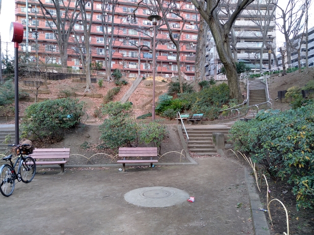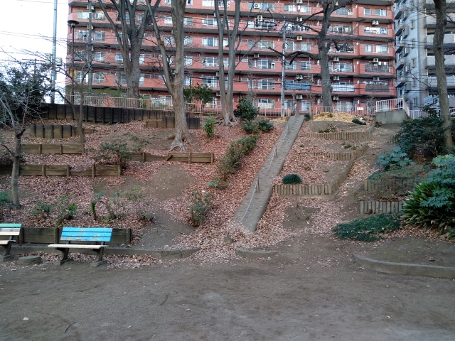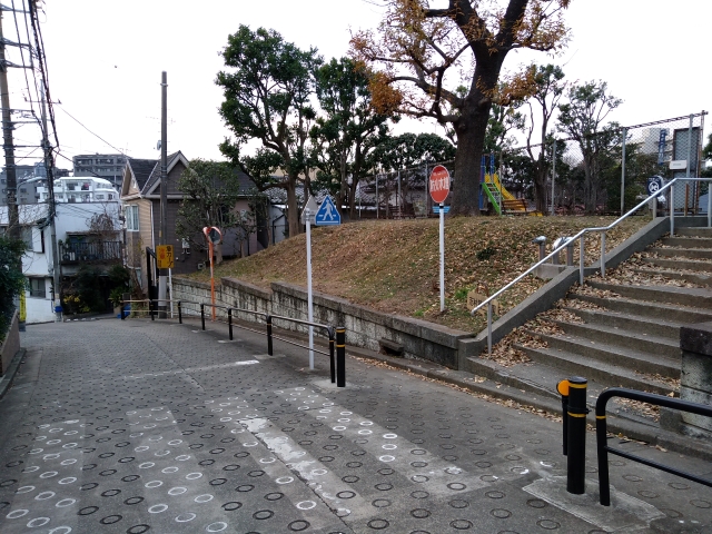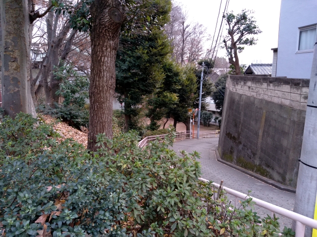 公園の高い部分のエリアから脇の下り坂を撮影。