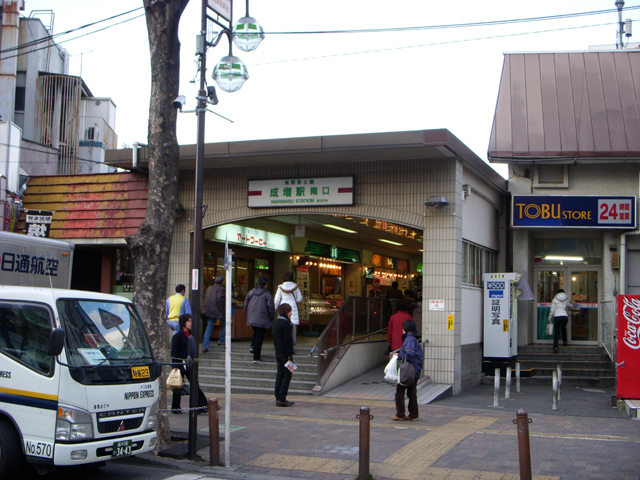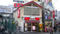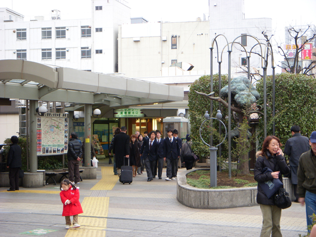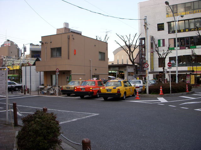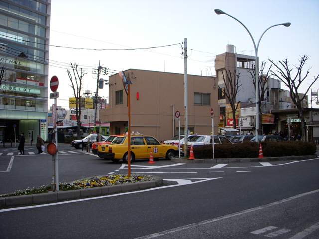 南口のロータリー。タクシープール、バス停がある。真ん中の黄土色の建物は交番。
