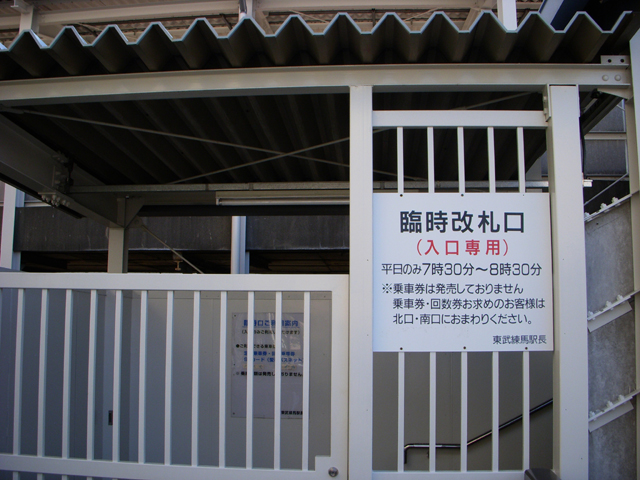 東武練馬駅臨時改札口。入り口専用で平日の朝7:30~8:30のみ利用可能。改札に入ると直接上りホームにでるが乗車券を販売していないので注意が必要。