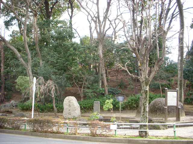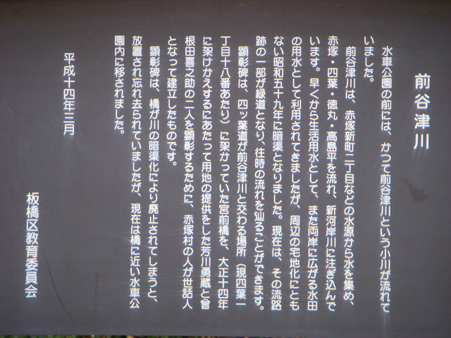 顕彰碑は、橋が川の暗渠化により廃止されてしまうと、放置され忘れ去られていましたが、現在は橋に近い水車公園内に移されました。