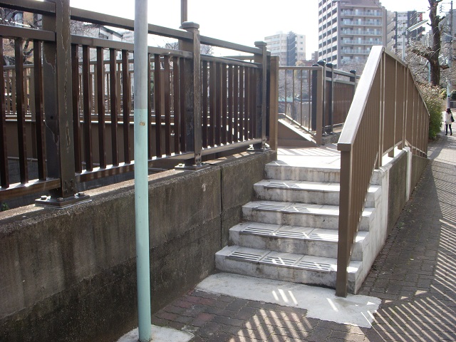 橋へは階段もしくはスロープが両沿岸にかかっている。