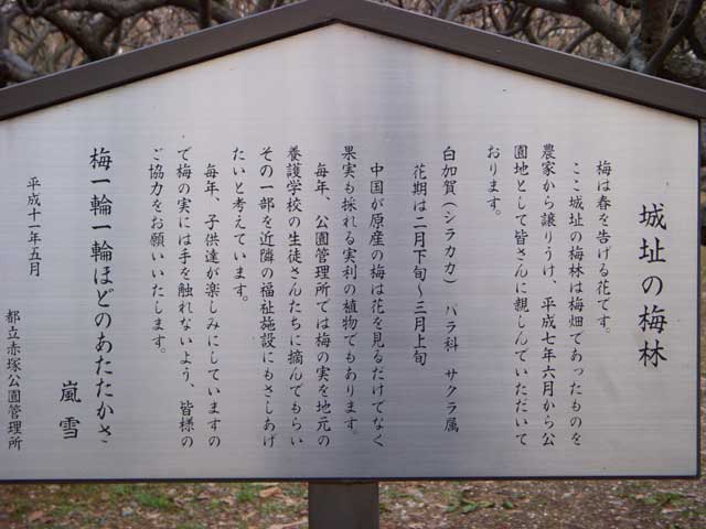 ここ城址の梅林は梅畑であったものを農地から譲りうけ、平成7年6月から公園地として皆さんに親しんでいただいております。