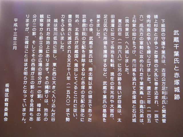 その後、武蔵千葉氏は、南北朝以来の領主であった京都鹿王院(ろくおういん)の支配を排除するなど赤塚の支配の強化に努め、北条氏が武蔵国へ進出してくるとこれに従い、豊臣秀吉に滅ぼされる天正18年(1590)まで勢力をふるいました。