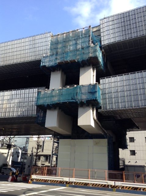 高架した高速道路を支える支柱が4車線仕様に徐々に変化している。
