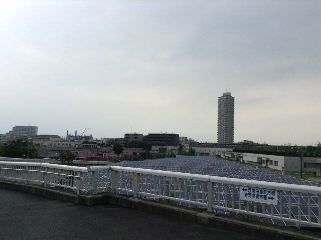 新河岸川に架かる長後さくら橋から浮間舟渡駅にむけて広がるソーラーパネル群。