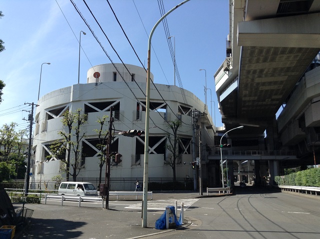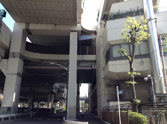 首都高5号線とつながっている建物。すぐ横に首都高の料金所がある。
